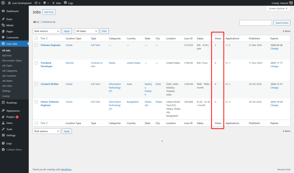The plugin can track how many unique visitors view each job listing on your site. View counts are displayed in the admin job list, giving you insight into which jobs attract the most attention.
