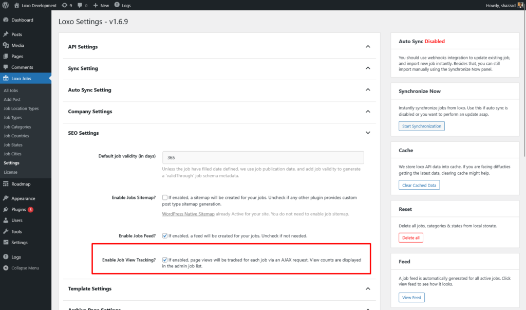 Go to Loxo Jobs → Settings and scroll to the SEO Settings section. Check Enable Job View Tracking and save. View tracking is enabled by default.